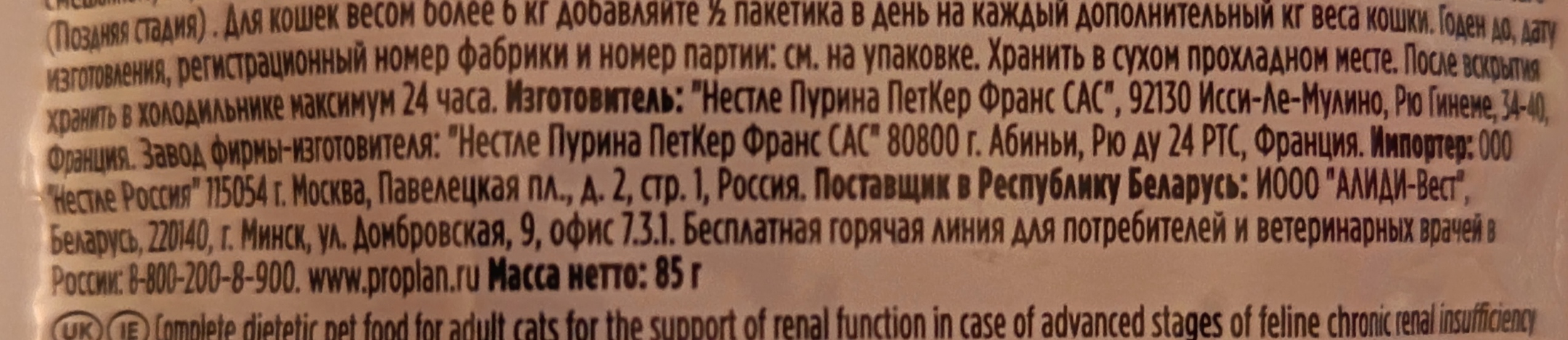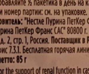 Производится корм в Испании, бывают перебои с поставками в Россию. Содержание белка, фосфора, кальция и натрия ограничено. Корм не очень калорийный. А как известно, у животных с хронической болезнью почек аппетит не всегда хороший, поэтому могут не съедать свою норму корма, соответственно, недополучат все необходимые питательные вещества. По отзывам в интернете по вкусу многим нравится. Детальный состав корма можно найти по ссылке.