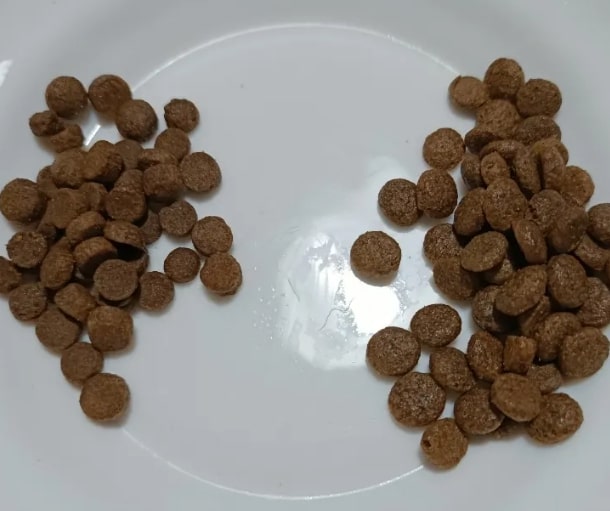 Купили после продолжительной паузы, долго не было в продаже, это — другая партия. По энтузиазму котов и запаху корма — разницы не заметила. Но форма и размер гранул стали больше, гранулы менее спрессованные и легче, имеют больший объем. И цвет гранул стал несколько светлее. Надеюсь рецептуру не меняли. На фото на блюдечке справа — новая партия корма, последняя, а слева — гранулы из прошлой партии (отзыв от 4.12.2025, корм индейка-тыква)