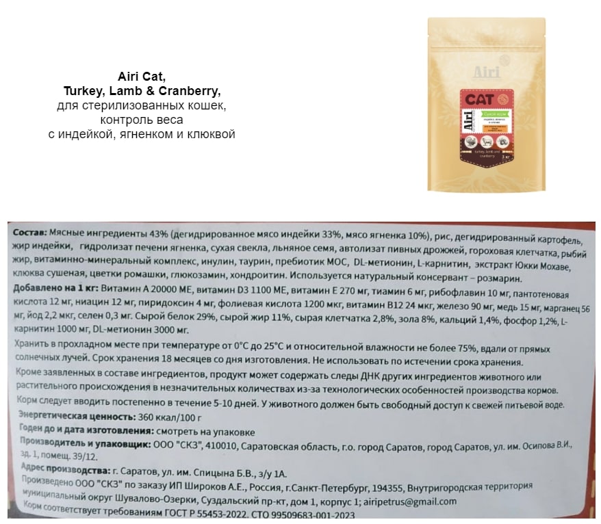 Рассмотрим состав корма Airi на примере варианта Turkey, Lamb & Cranberry (для стерилизованных кошек, контроль веса, с индейкой, ягненком и клюквой).