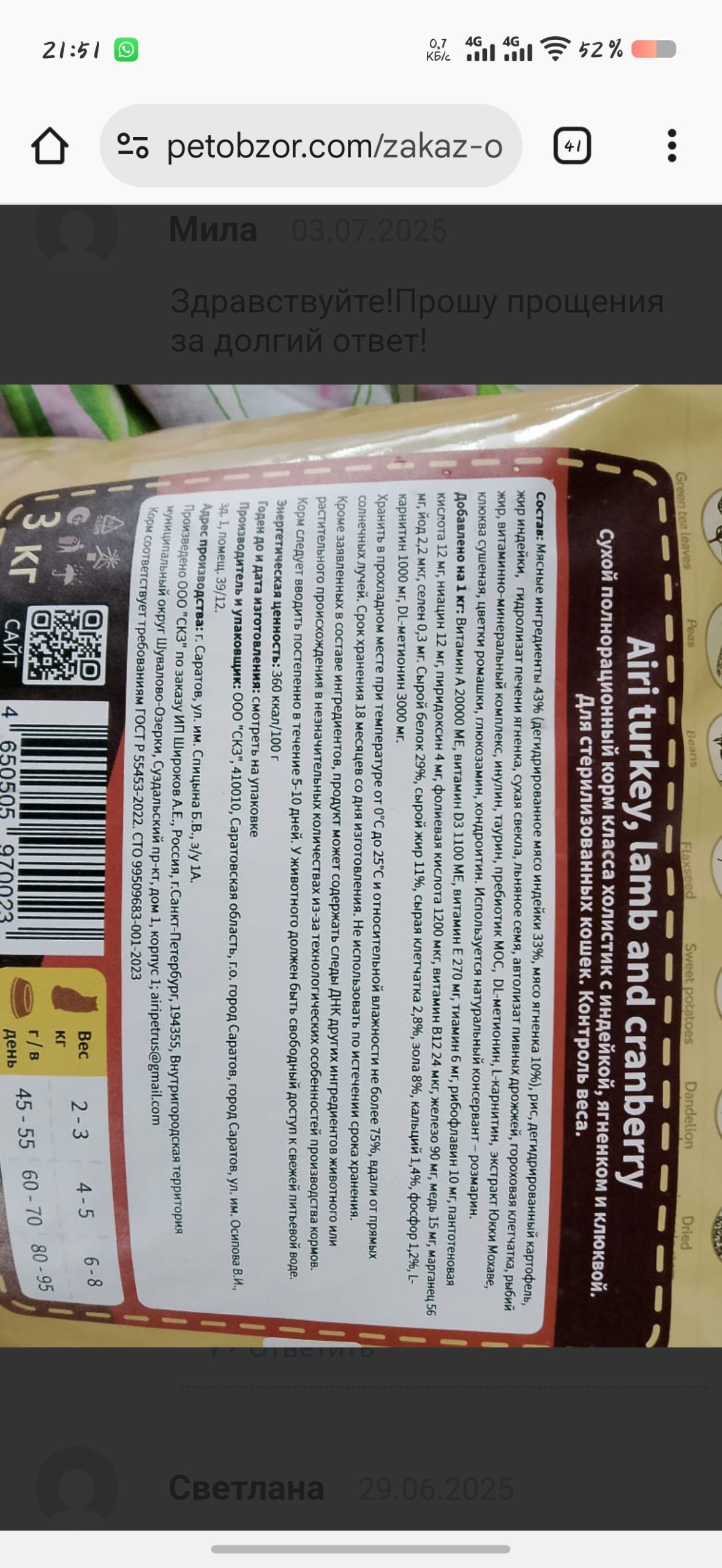 Сухие корма для кошек Airi продаются давно, но корма российского производства появились в продаже в 2025 году. Ниже мы собрали несколько отзывов о новом корме.