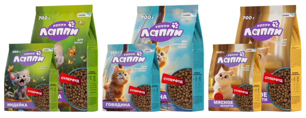 Кроме корма для кошек также выпускается корм Хаппи Лаппи для собак.