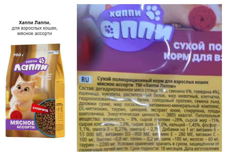Ознакомимся с составом корма Хаппи Лаппи на примере варианта для взрослых кошек, мясное ассорти: