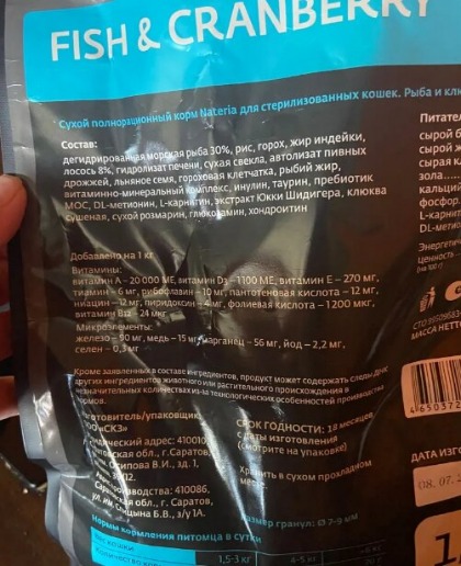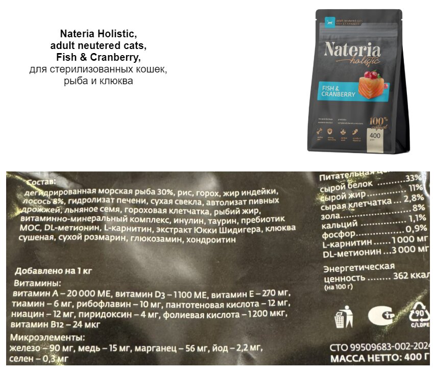 Ознакомимся с составом корма Nateria на примере варианта adult neutered cats, fish & cranberry (для стерилизованных кошек, рыба и клюква):