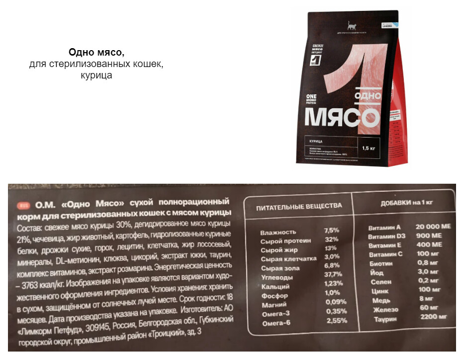 Корма для кошек Одно мясо производятся в России в Белгородской области на заводе АО «Лимкорм Петфуд». Официальный сайт — https://onemeat-pet.ru/, на нем есть вся важная информация о всей линейке кормов (составы, нормы кормления, описание ингредиентов и т.п.). Данный корм относится к супер премиум классу.