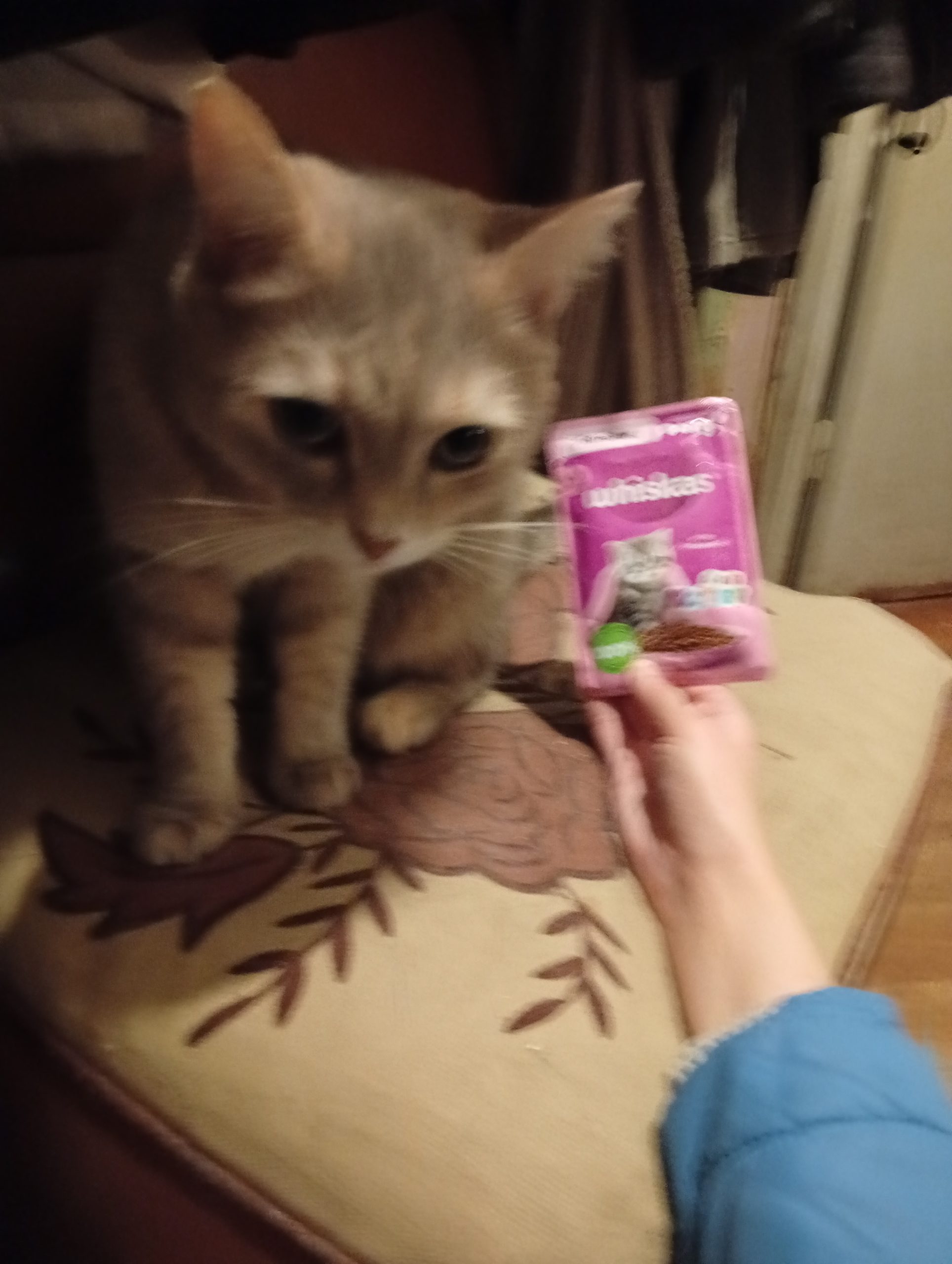 Обычно покупаю Purina One, но в последний раз взяла Whiskas. Кошка на него отреагировала необычно, ела очень аппетитно и потом возле пакетика крутилась выпрашивая добавки. Корм явно вызвал интерес.