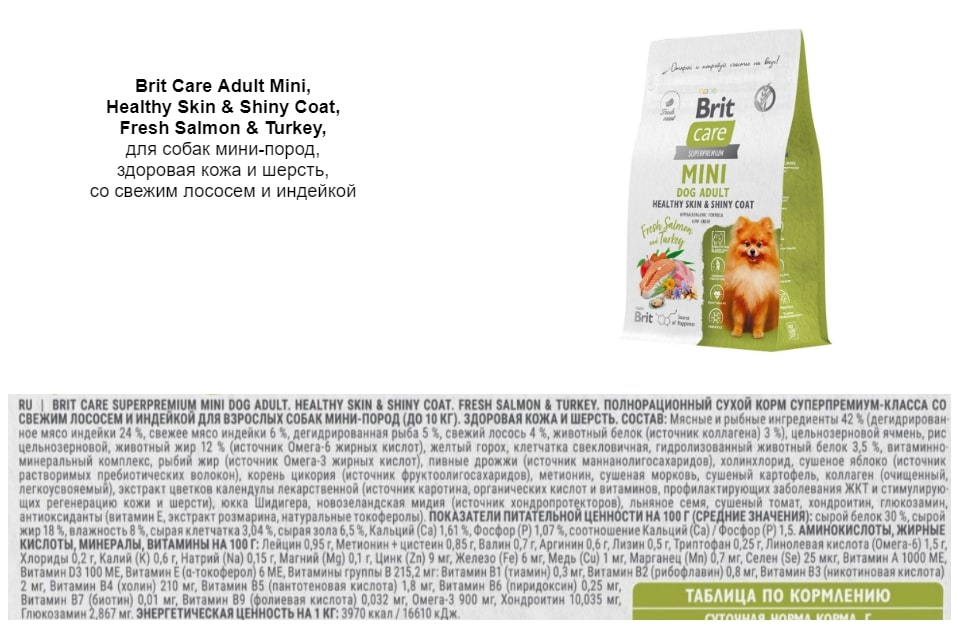 Рассмотрим состав Brit Care взяв в качестве примера вариант Adult Mini Healthy Skin & Shyni Coat, Fresh Salmon & Turkey (для взрослых собак мини-пород, здоровая кожа и шерсть, со свежим лососем и индейкой).