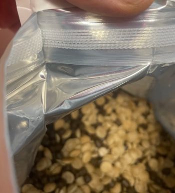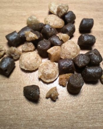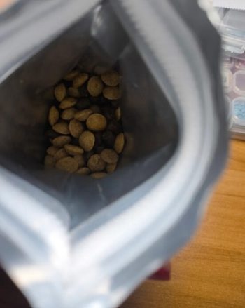 Необычность корма заключается в том, что имеется 2 гранулы: темная — мясная и светлая — растительная.