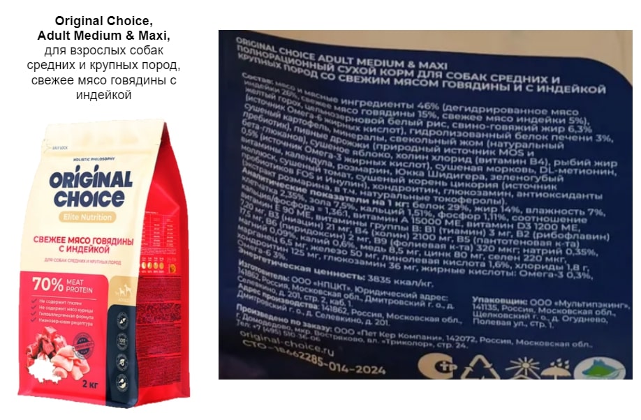 Сухие корма Original Choice («Ориджинал Чойс») для собак производятся в России на заводе ООО «НПЦКТ» по заказу ООО «Пет Кер Компани» (Московская обл., г. Домодедово). Официальный сайт, указанный на упаковке, не работает, составы кормов можно найти на маркетплейсах. Относится данный корм к супер премиум классу.