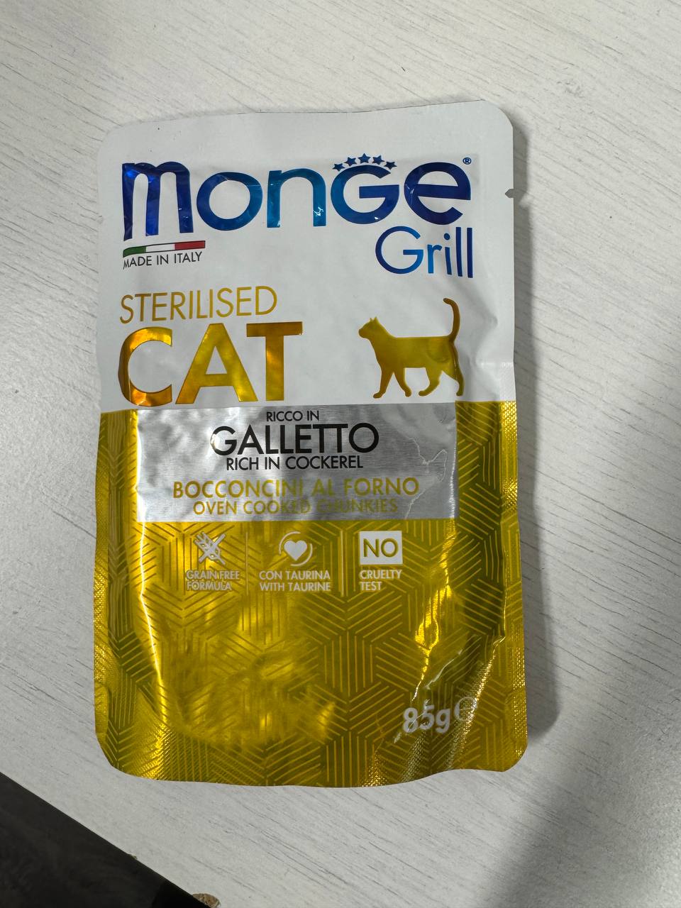Кошка съела охотно только соус, но ее вырвало. После других более бюджетных такого не было, не знаю, что послужило причиной, кошка возрастная. Но в любом случае это не нормально. (Monge Grill)